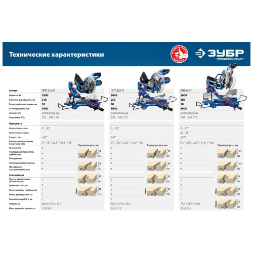 Торцовочная пила с протяжкой ЗУБР Профессионал ППТ-216-П предназначена для прямого, косого, под наклоном и комбинированного пиления. Подходит для работы с заготовками из древесины и ее производных (в т. ч. и с пластиковыми покрытиями), тонкого алюминиевого профиля (при установке соответствующего диска).