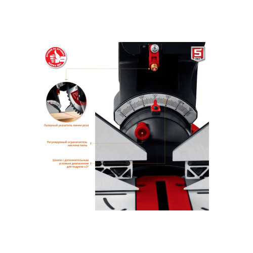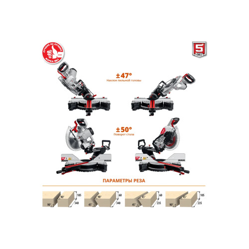 Подвижная пильная голова имеет возможность наклона в обе стороны на 47°.