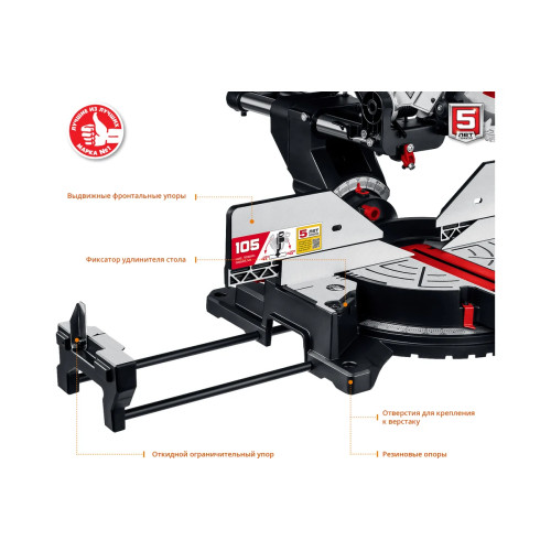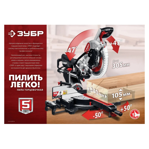 Торцовочная пила с протяжкой ЗУБР ЗПТ-305-1800 ПЛ подходит для прямого, косого, наклонного и комбинированного пиления. Работает с древесиной и производными от нее материалами (в том числе с пластиком).