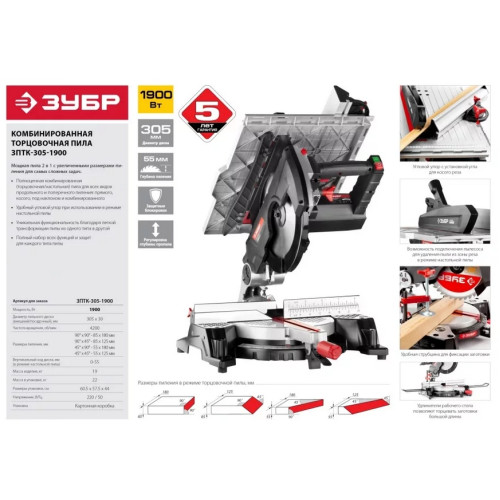 Торцовочная комбинированная пила Зубр МАСТЕР ЗПТК-305-1900 представляет собой многофункциональное устройство, сочетающее в себе настольную и торцовочную пилу. Она предназначена для различных видов продольного и поперечного пиления: прямого, косого, под наклоном и комбинированного. Для надежной фиксации заготовок предусмотрена удобная струбцина. Наличие удлинителей рабочего стола позволяет обрабатывать заготовки большой длины. Диапазон вертикального хода диска - 0-55 мм.