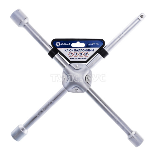 Ключ баллонный крестообразный КОБАЛЬТ 244-926 предназначен для завинчивания/отвинчивания колесных гаек автомобилей с размерами гайки 17, 19, 21 мм. Имеет присоединительный квадрат 1/2" для установки головок других размеров. Изготовлен из хром-ванадиевой стали (CrV). Габариты 400х400мм, масса 1,4кг.