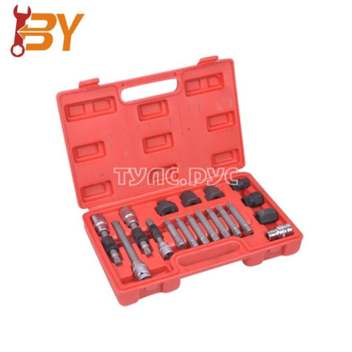 Съемник шкива генератора 18 предметов, полный набор AE&T TA-A1087 представляет собой удобное дополнение для комплекта инструментов автомеханика.Использование оборудования значительно уменьшает время, необходимое на обслуживание двигателя. Комплект уложен в прочный кейс.