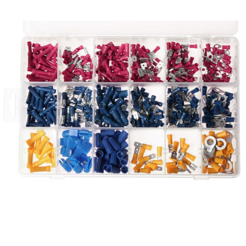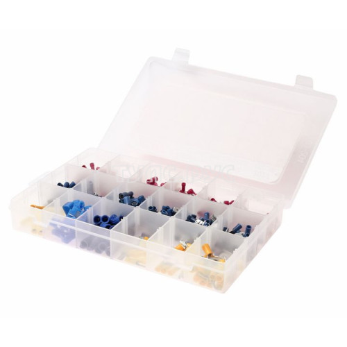 Набор изолированных автомобильных клемм, 530 шт JTC 2027 поставляется в эргономичном пластиковом боксе, который имеет специальные ячейки под каждый тип клемм и наконечников. Цветовая индикация (красный, желтый, синий) делает сортировку и выбор более комфортным. Изделия предназначены для быстрого и качественного монтажа электрических узлов автотранспорта. Благодаря малому весу - 0.764 кг, и небольшим размерам, данный комплект не занимает много места, его удобно хранить и транспортировать. Всего в наборе 18 типоразмеров клемм.