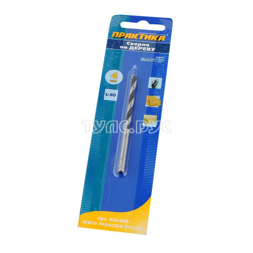 Сверло по дереву ПРАКТИКА 4 х 80 мм (1шт.) блистер, серия Мастер 034-809