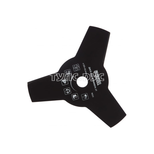 Диск для триммера, 3 лезвия DENZEL 96325 справляется с жесткой травой и мелкой порослью кустарников. Изготовлен из стали толщиной 1,6 мм и окрашен краской.