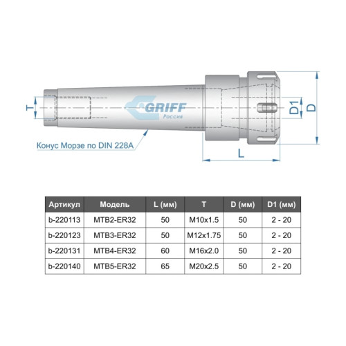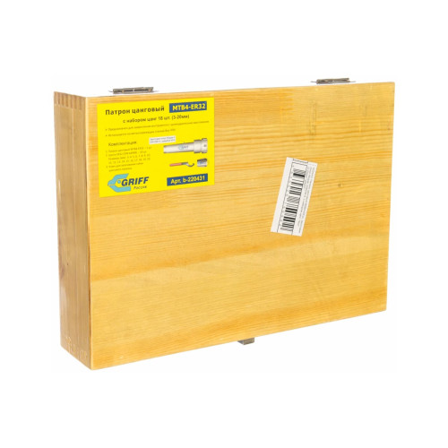 Патрон цанговый GRIFF MSB4-ER32, хвостовик конус Морзе, DIN228-A, с набором цанг 18 шт. 3-20 мм b220431 предназначен для станков без ЧПУ.