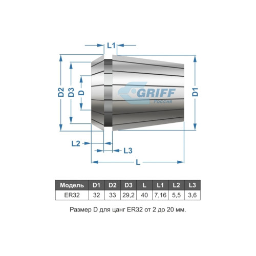 - Цанги ER32 (DIN 6499B) 6 шт.: 3; 4; 5; 6; 7; 8; 9; 10; 11; 12; 13; 14; 15; 16; 17; 18; 19; 20 мм