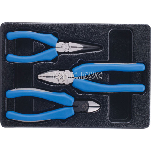 Набор плоскогубцев и бокорезов (ложемент, 3 предмета) KING TONY 9-40103GP предназначается для комплектования инструментальной тележки автослесаря, механика, работника промышленного цеха. В комплект поставки входят наиболее востребованные ручные инструменты - бокорезы, плоскогубцы и тонкогубцы. Каждый элемент набора размещается в специальном углублении ложемента из поливинилхлорида. Материал рукоятей - полипропилен и термопластичная резина.