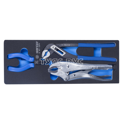 Набор плоскогубцев, переставных клещей и зажима, ложемент, 3шт KING TONY 9-40113GPV служит для выполнения широко спектра ремонтно-монтажных работ. Все компоненты данного набора располагаются на ложементе для возможности дополнения инструментальной тележки и нахождения всегда под рукой на рабочем месте мастера. Материалом для изготовления ложемента служит прочный, надежный, износостойкий, не деформируемый материал EVA (ЭВА, этиленвинилацетат).