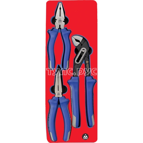 Набор пассатижей, плоскогубцев и бокорезов, ложемент, 3шт МАСТАК 5-3003 используется для укомплектовывания передвижных инструментальных тележек или слесарных верстаков при создании персональных рабочих мест для мастеров на СТО, в автосервисах, различных мастерских и на предприятиях. Данные приспособления станут надежными помощниками в сфере ремонта и обслуживания различных механизмов и агрегатов. Инструменты выполнены из прочного материала EVA.