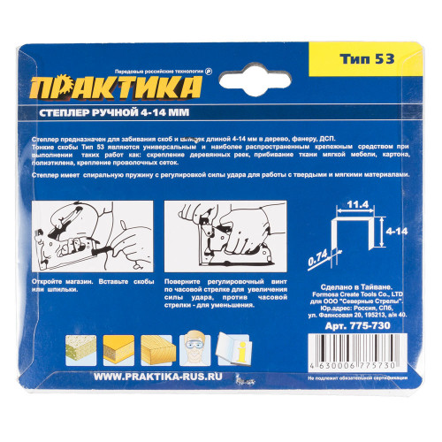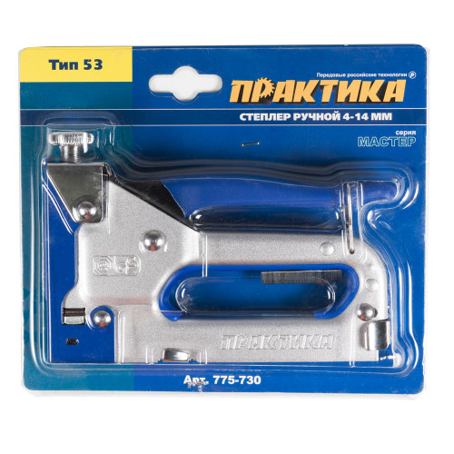 Степлер ручной скобы с регулятором удара (4-14 мм) ПРАКТИКА 775-730 - степлер предназначен для забивания скоб и шпилек в дерево, фанеру, ДСП. Степлер имеет спиральную боевую пружину с регулировкой силы удара для работы с твердыми и мягкими материалами и обрезиненную рукоятку для более удобной работы.