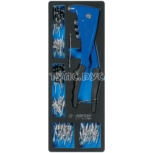 Заклепочник с набором заклепок, ложемент, 121 предмет KING TONY 9-21-20-07MRV предназначен для скрепления металлических листов с помощью алюминиевых заклепок.