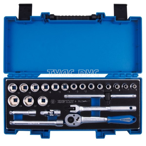 Набор торцевых головок с принадлежностями King Tony 3/8", 6-24 мм, 23 предмета 3523MRV11 предназначены для откручивания и закручивания крепежа при ремонте и обслуживании автомобилей, мотоциклетной, садовой и другой техники, промышленного и бытового оборудования и др. Набор применяется профессионалами и частными мастерами.