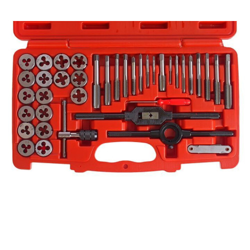 Набор метчиков и плашек, 40 предметов JTC 3432A позволяет быстро и качественно осуществить нарезание резьбы различных размеров как на внутренних, так и на внешних металлических поверхностях различных деталей. Комплектуется удобным кейсом, в котором предусмотрены индивидуальные ложементы (под каждое из изделий), специальные замки-защелки (исключают открывание во время транспортировки), а также эргономичной рукояткой с широкой поверхностью хвата.