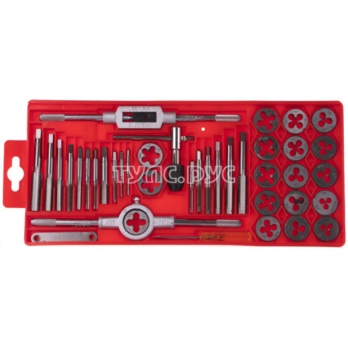 Набор резьбонарезного инструмента ЗУБР 2810-H40_z01 - комплект из 40 профессиональных инструментов, которые применяются для нарезки всевозможных видов резьбы. Выполнены из инструментальной легированной стали 9ХС и обладают высокой прочностью. В комплекте два метчикодержателя, плашкодержатель, резьбомер, отвертка и наборы из 17 плашек и метчиков размерами 3х0,5; 3х0,6; 4х0,7; 4х0,75; 5х0,8; 5х0,9; 6х1,0; 6х0,75; 7х1,0; 7х0,75; 8х1,25; 8х1,0; 10х1,5; 10х1,25; 12х1,75; 12х1,5; 1/8-27.