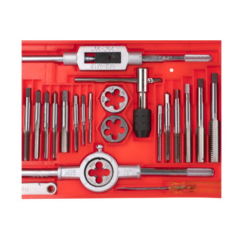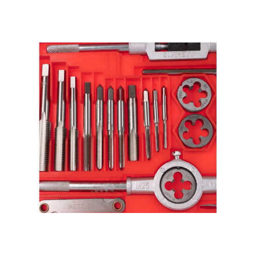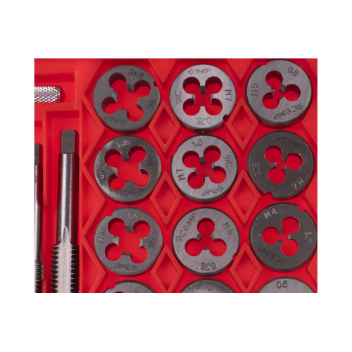 - Плашки 17 шт: 3х0,5; 3х0,6; 4х0,7; 4х0,75; 5х0,8; 5х0,9; 6х1,0; 6х0,75; 7х1,0; 7х0,75; 8х1,25; 8х1,0; 10х1,5; 10х1,25; 12х1,75; 12х1,5; 1/8-27.